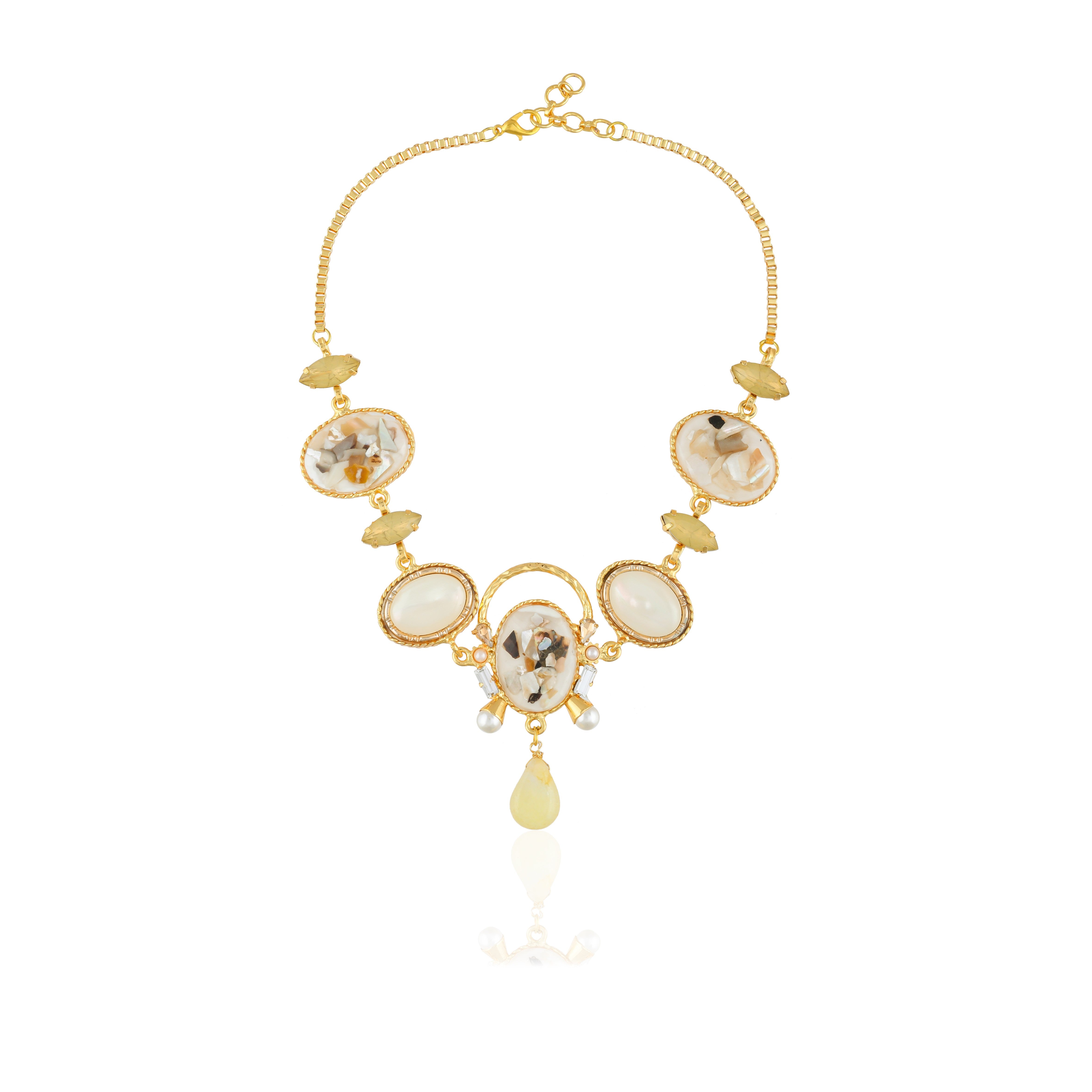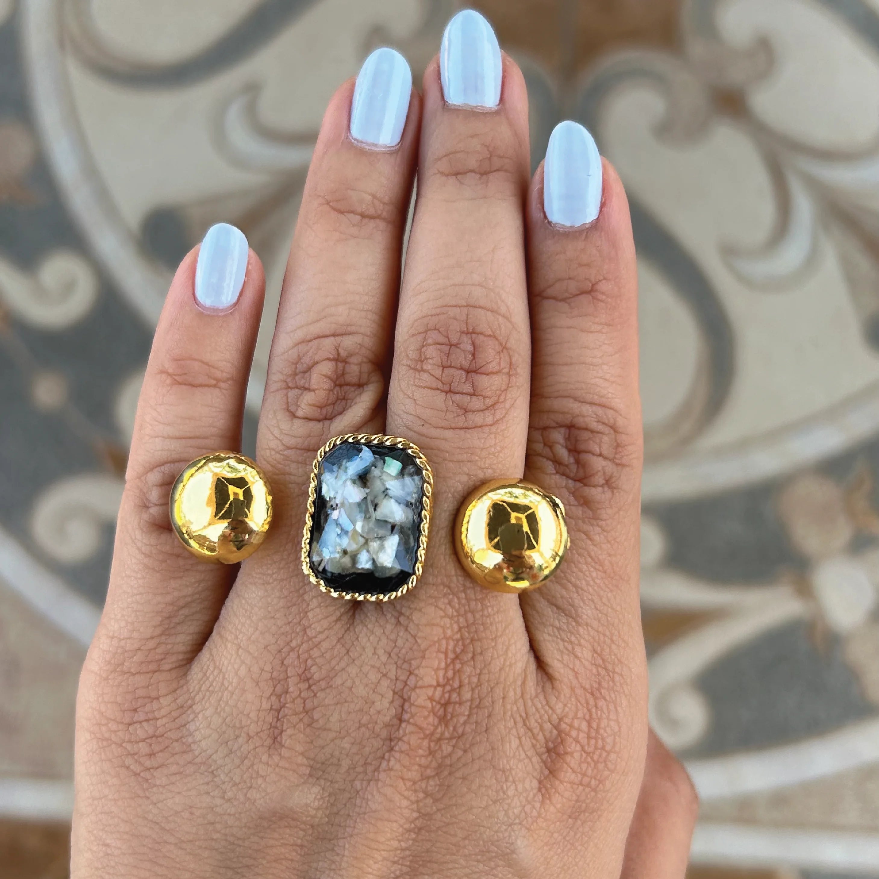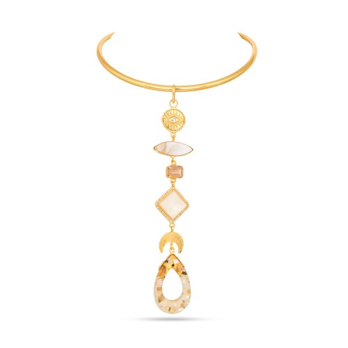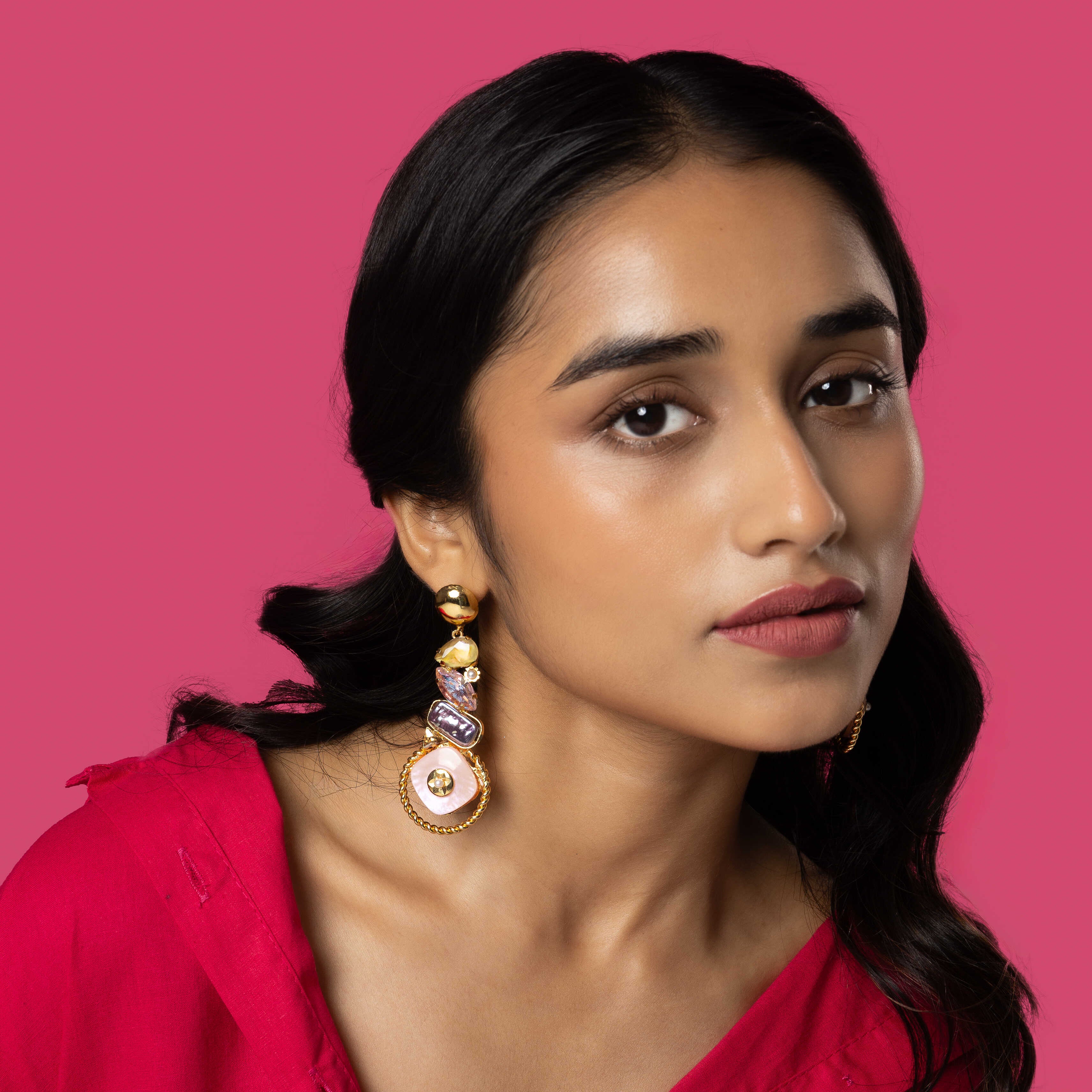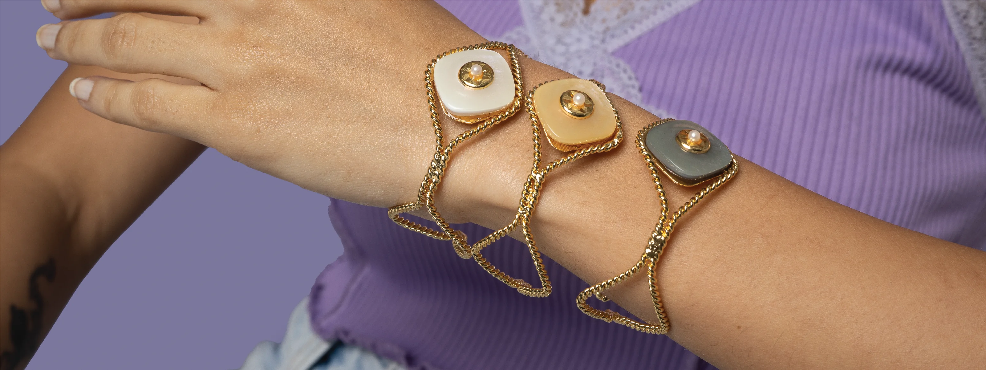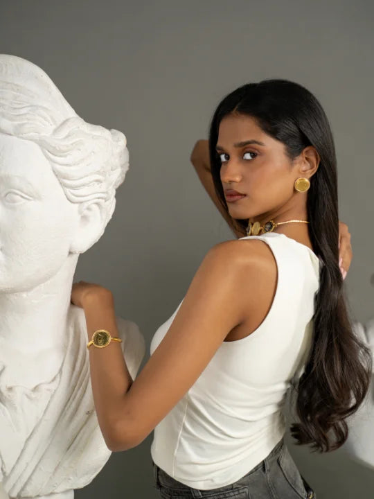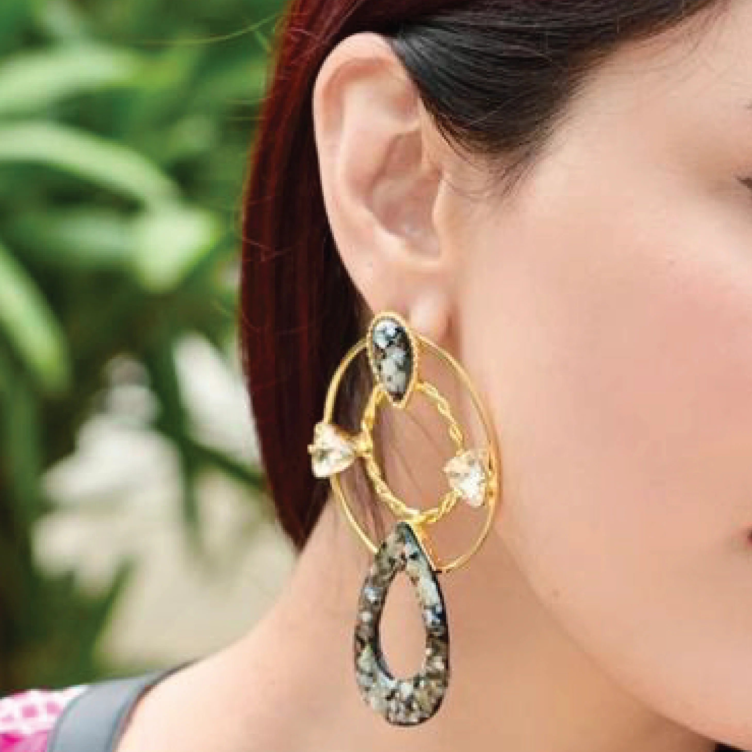 Our core metal is brass with 14k gold plating which is anti-tarnish and skin friendly. We use natural stones which retain their original color and shape which are ethically sourced across our vendor base worldwide