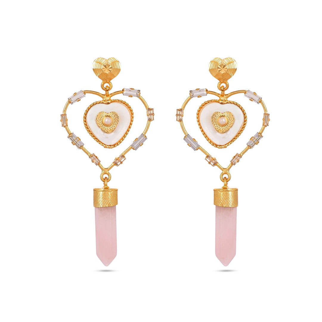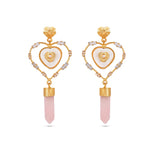 Destined to be your next crush. Mother of pearl hearts decorated with Swarovski and natural rose quartz obelisk drops lend them heavenly vibes  Compliments are guaranteed.