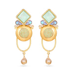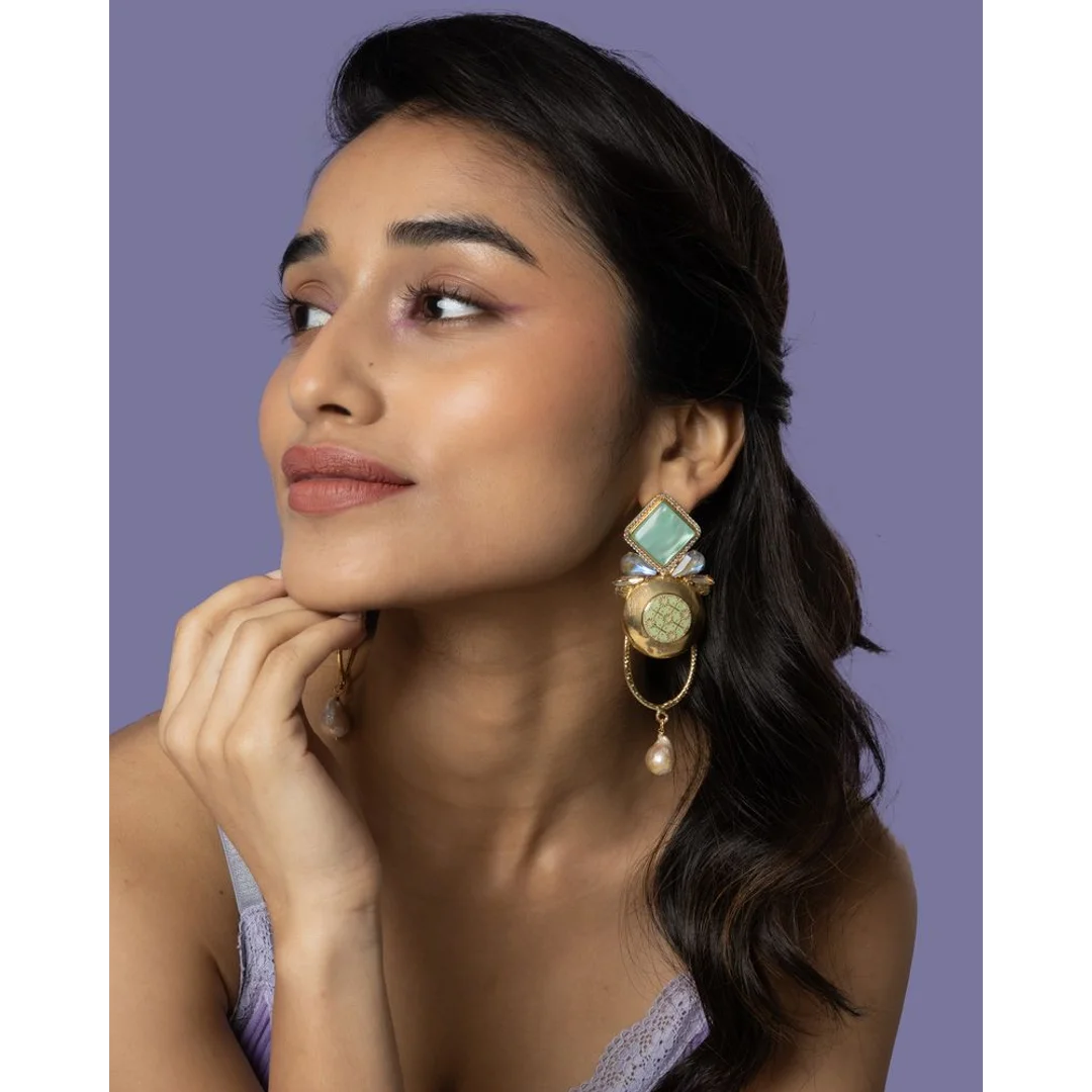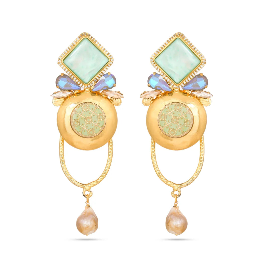 An ode to grand statement earrings with our motif sandstone gold metal work and natural baroque pearl drops. Style it with heavy dresses and outshine.