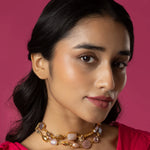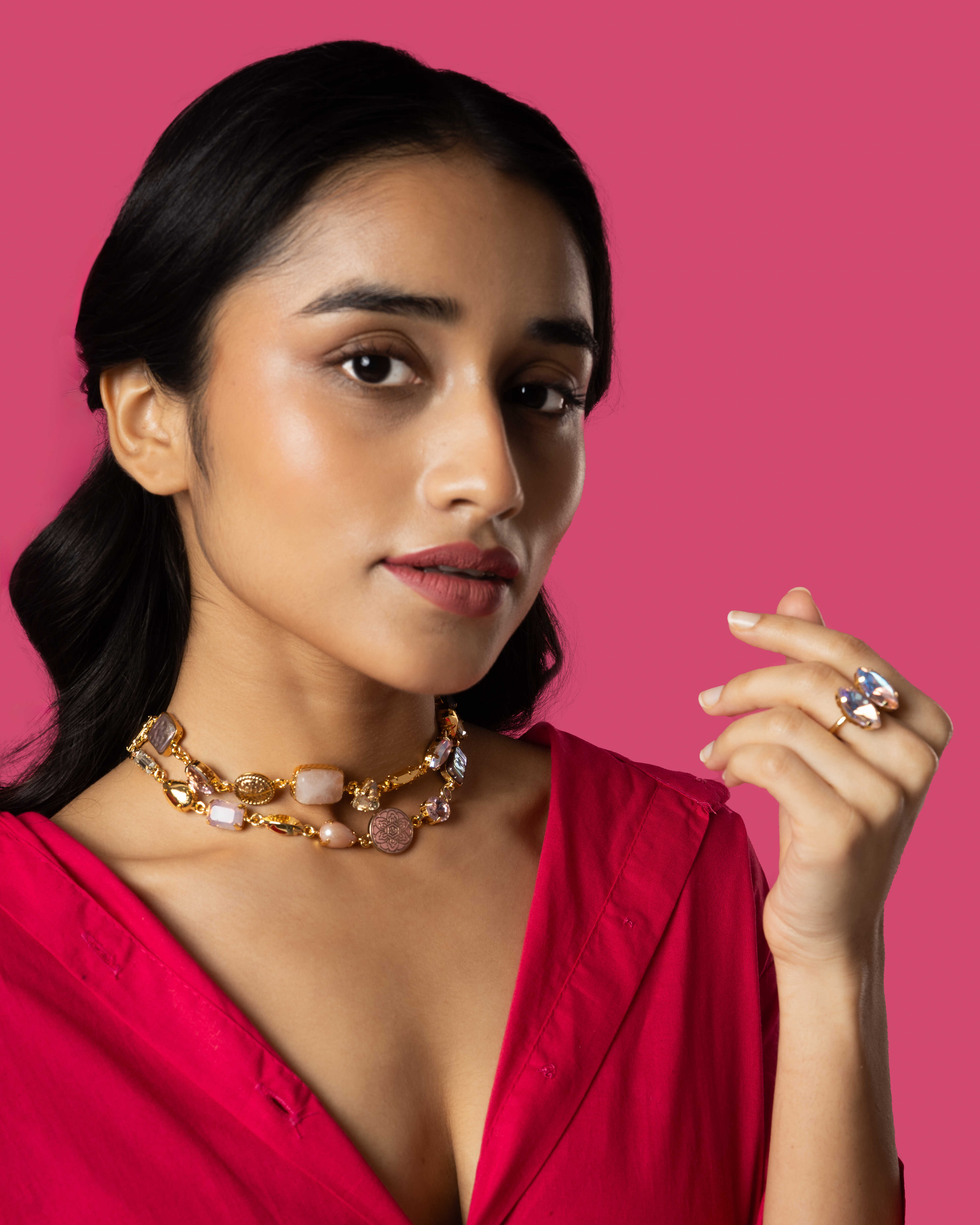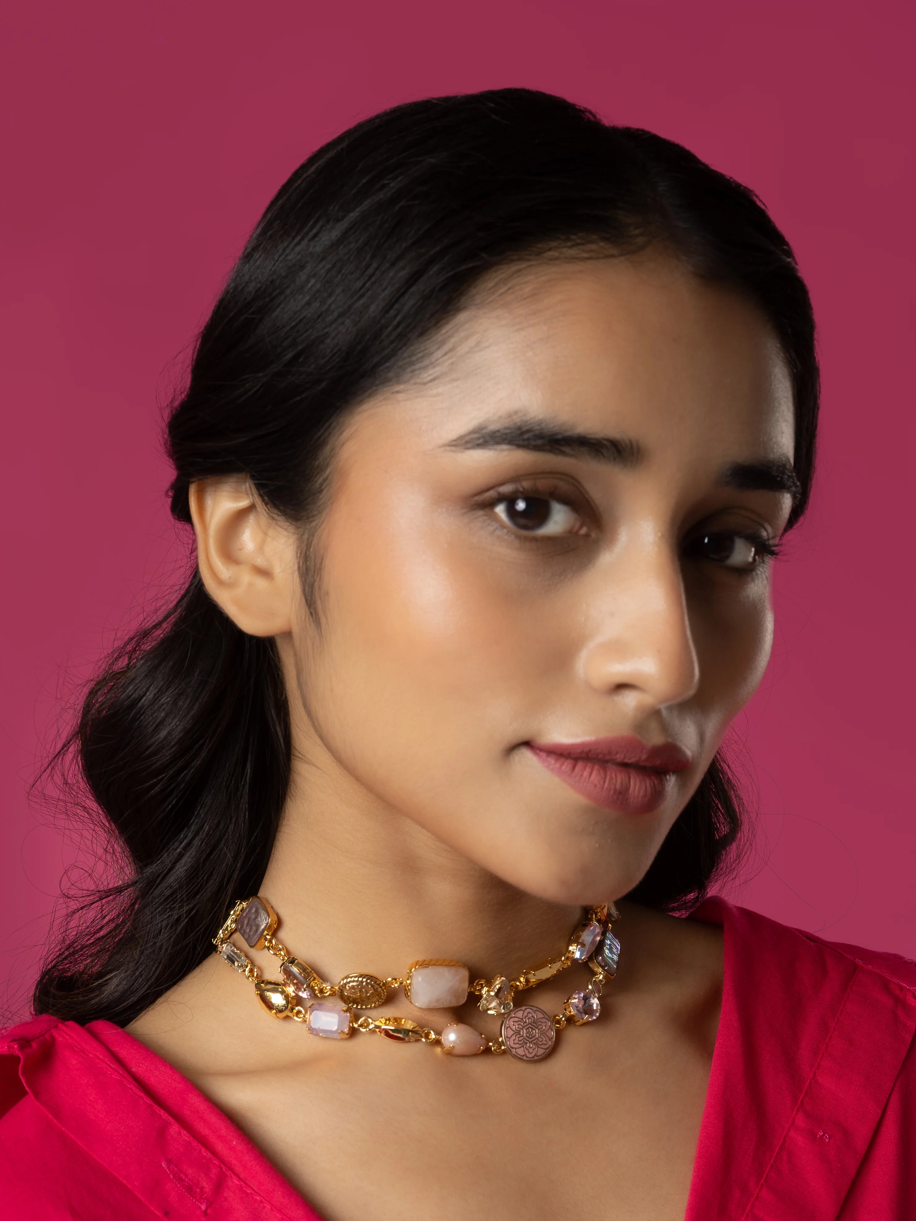 A dazzling dual layer choker with nuetral color pallette of natural stones in unique shapes. This creative stunner will make a bold style statement