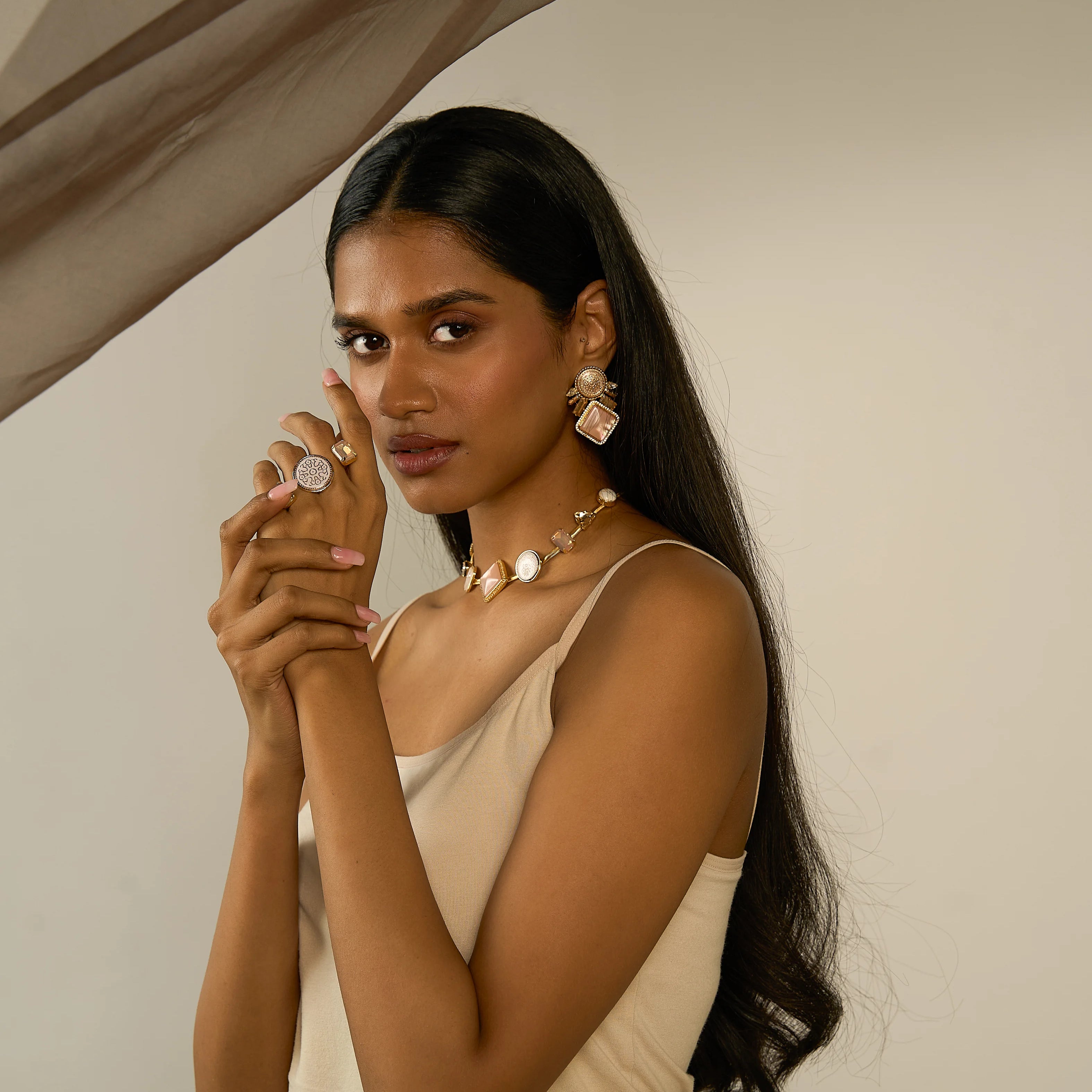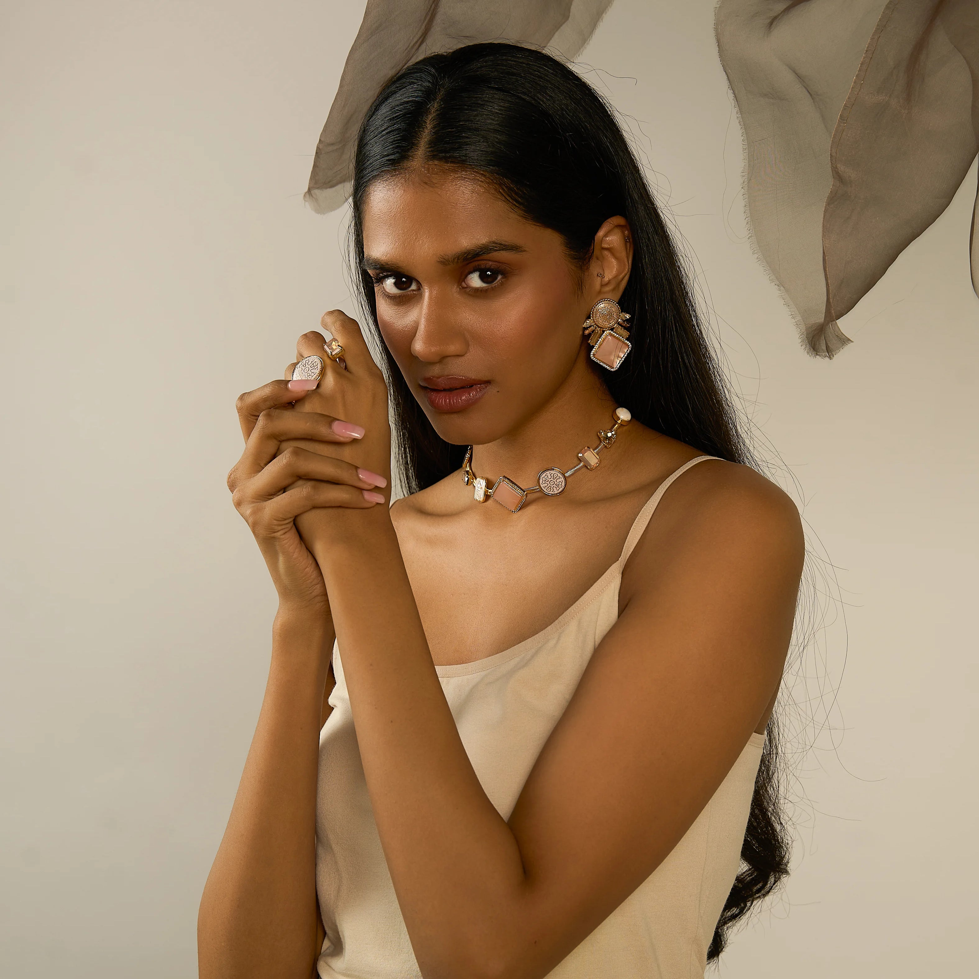 A realm of enduring sophistication, where each jewel seamlessly merges classic design with a contemporary twist. Inspired by the opulence of radiant pearls and the grace of peach moonstone, every piece evokes timeless glamour and modern elegance.