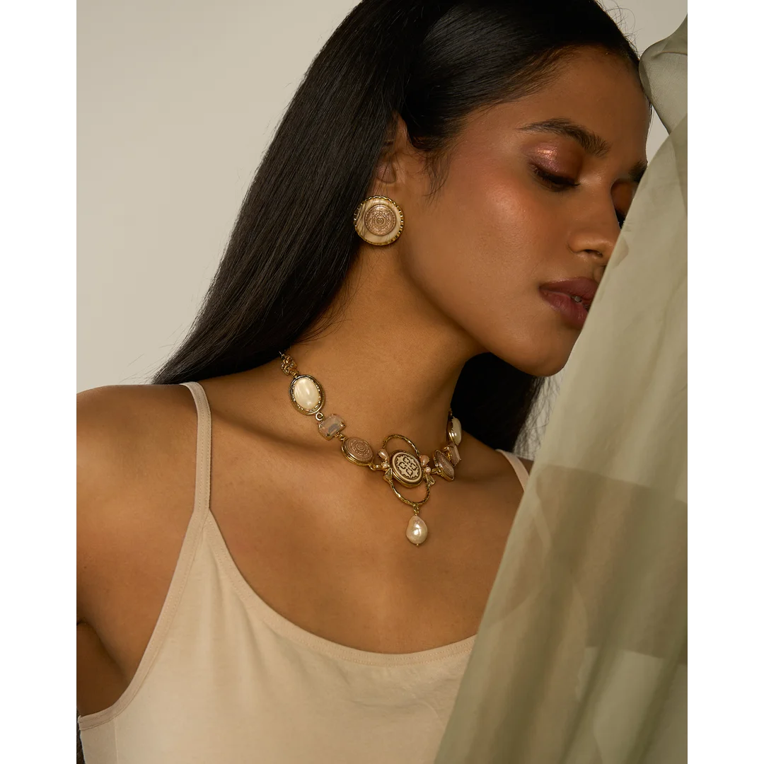 Our signature etched motif round shaped pearl studs. Vintage look with a modern twist these elegant studs elevate your looks.