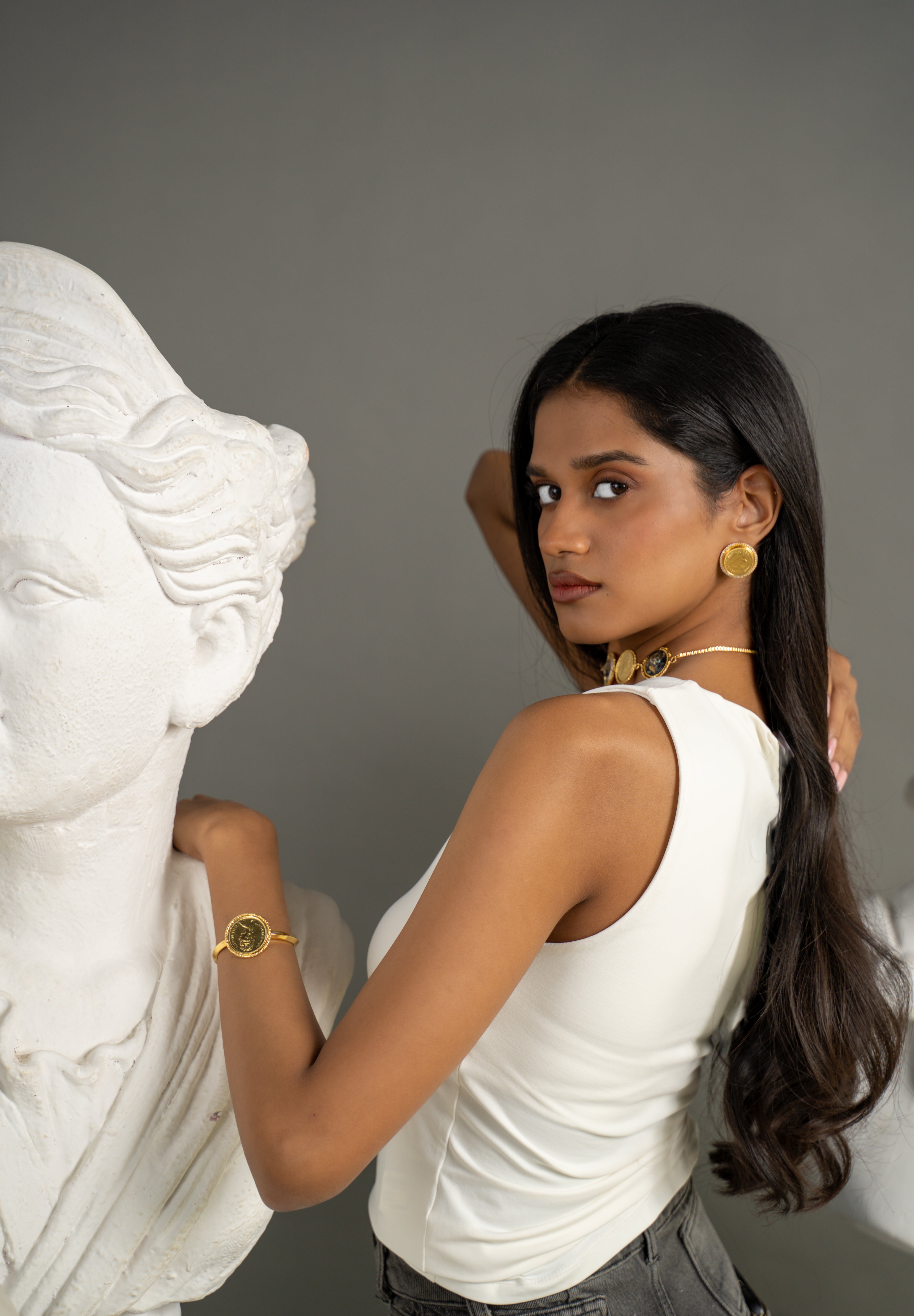 Vintage charm meets modern minimalism in these gold-plated coin studs. Simple yet sophisticated, they’ll be your new go-to for an effortlessly polished look.