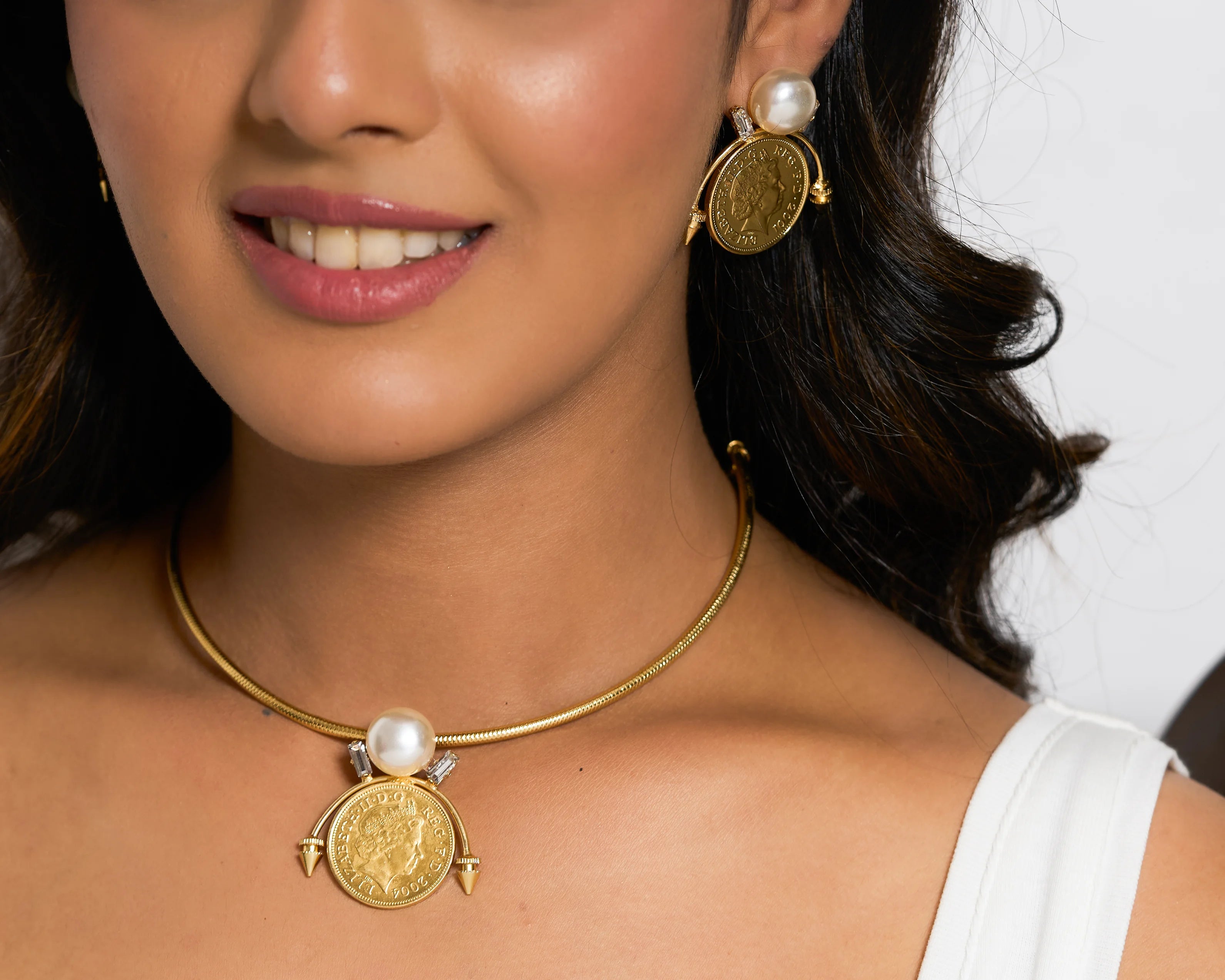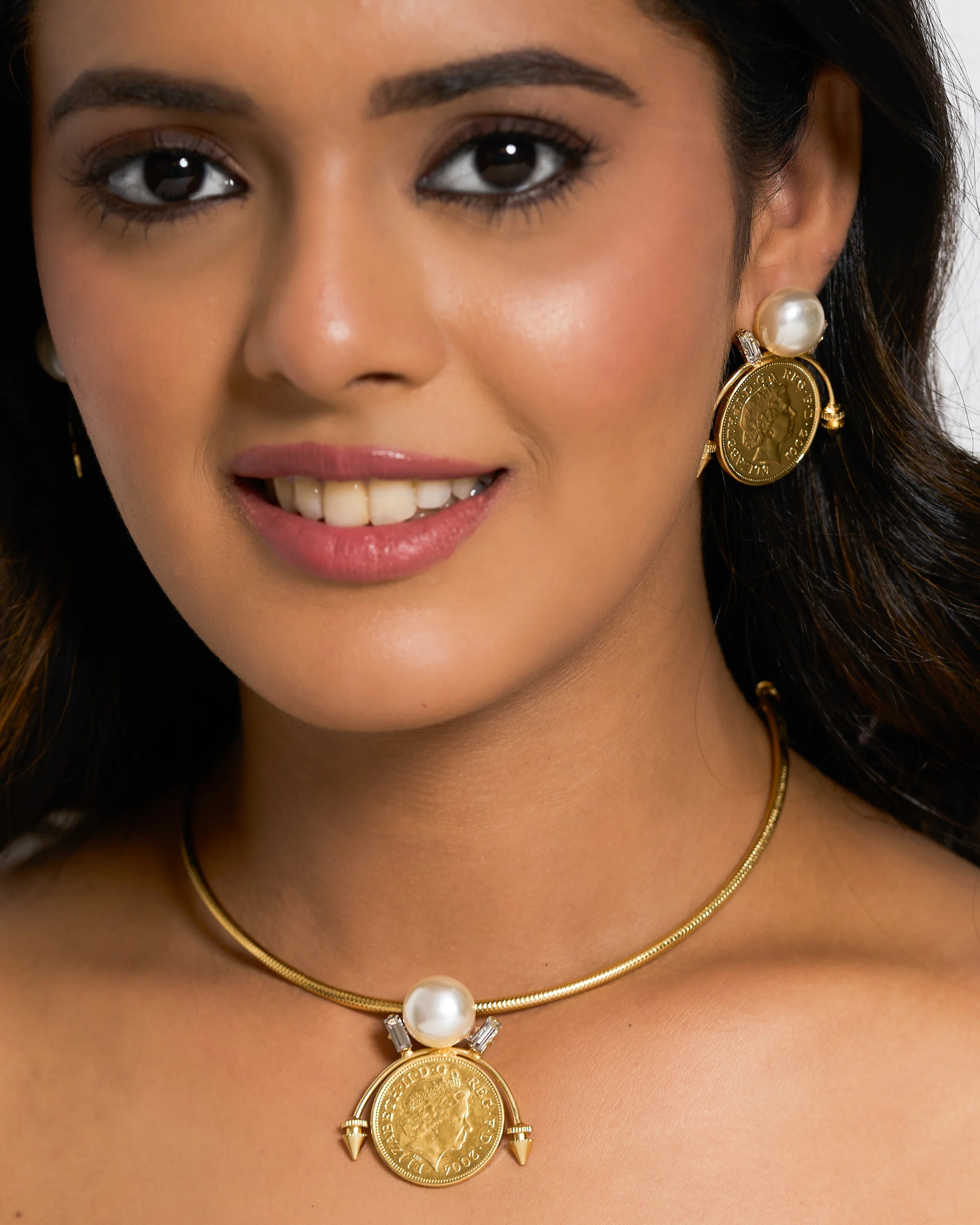 A classic vintage coin and pearl choker to fulfill your anytime styling needs. Flaunt them with your over sized collared shirts for maximum impact