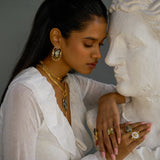 Our core metal is brass with 14k gold plating which is anti-tarnish and skin friendly. We use natural stones which retain their original color and shape which are ethically sourced across our vendor base worldwide