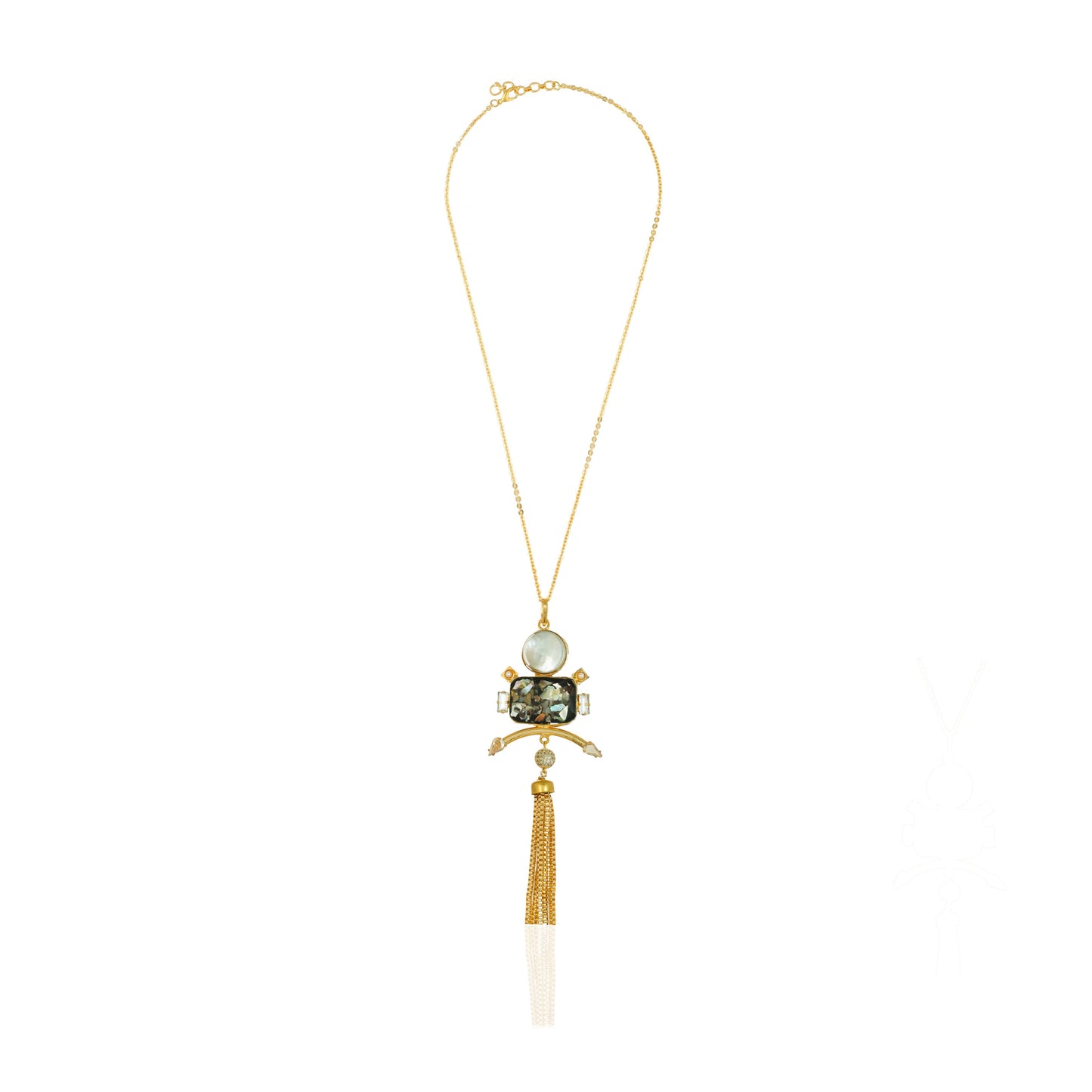 A top seller for a reason. This pendant, featuring mother-of-pearl and gold metal tassels, instantly adds the spark you need to turn any look into a head-turner.